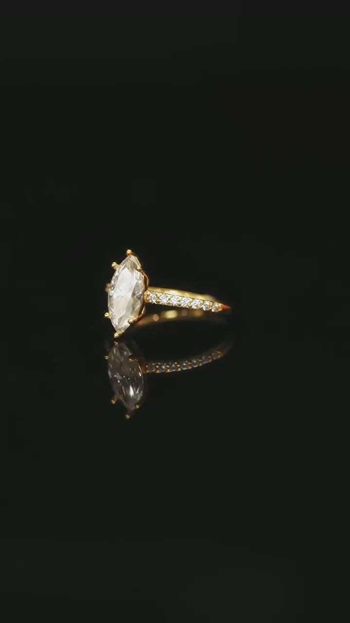 The Radiant Marquise Ring features a brilliant 1 carat marquise-cut moissanite, gracefully set atop a sleek gold-plated 925 silver band. With its elongated silhouette and sparkling clarity, this design blends classic elegance with modern sophistication. A timeless piece that elevates everyday style and shines on special occasions with refined charm.