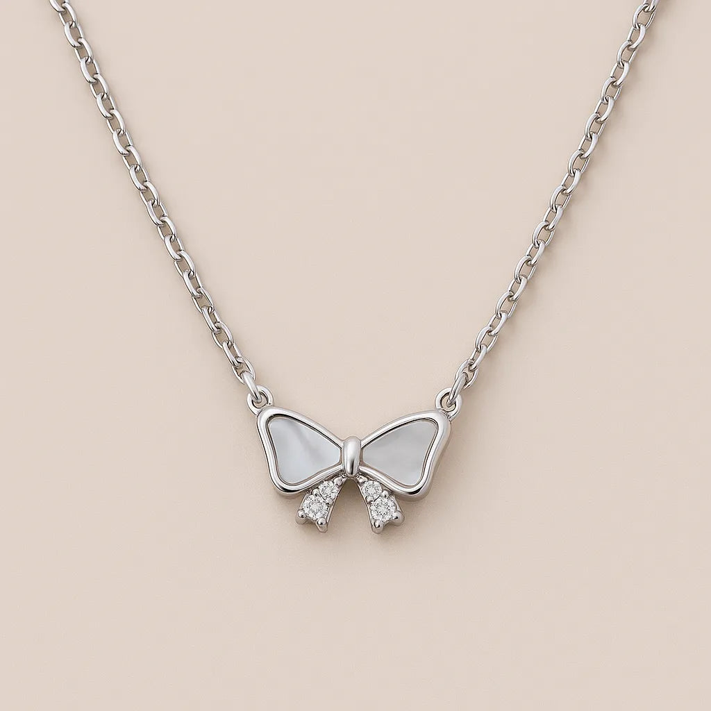 This delicate necklace features a finely crafted bow-shaped pendant, made from premium 925 silver and accented with a smooth mother‑of‑pearl inlay at the center. The soft curves of the bow reflect light beautifully, creating a gentle shimmer with every movement.